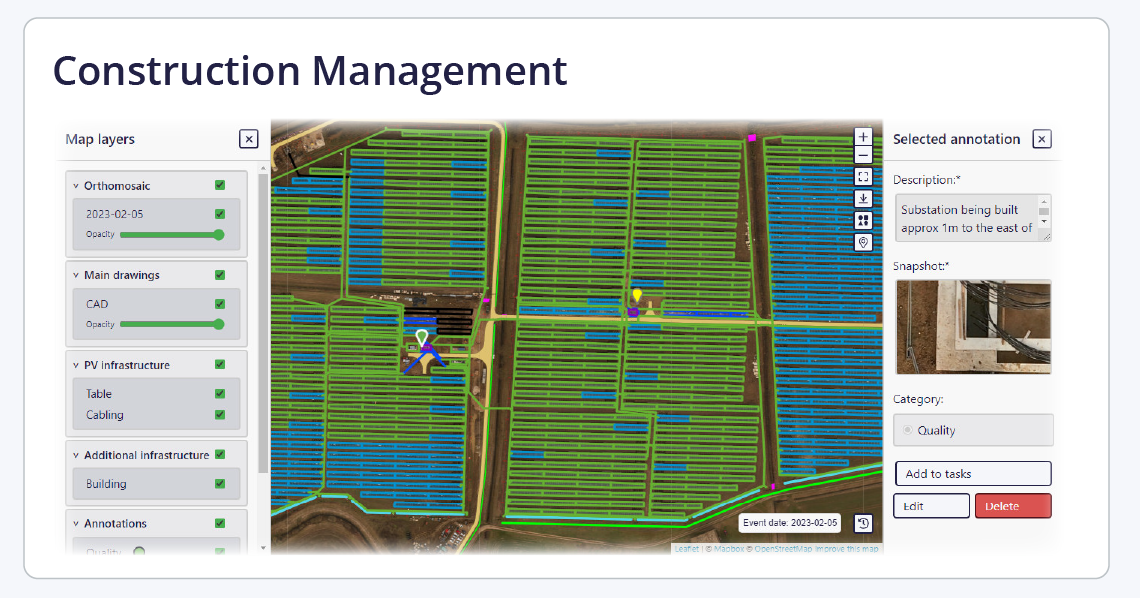 Above collects high-resolution aerial imagery, thermographic data (when required), and field-level documentation. Together, these create a traceable record of each stage, from first pile to energisation.